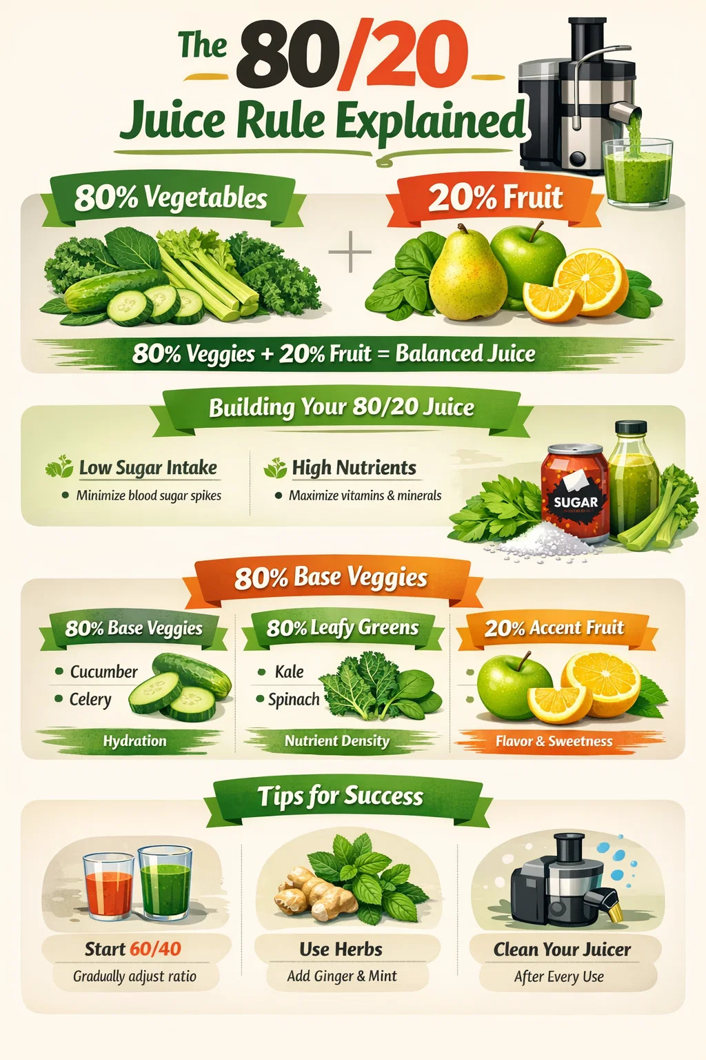 các Quy tắc 80/20 khi ép trái cây là một hướng dẫn dinh dưỡng nêu rõ rằng với mỗi ly nước trái cây bạn sản xuất, 80% nguyên liệu phải là rau và chỉ 20% là trái cây . Tỷ lệ này được thiết kế để tối đa hóa việc hấp thụ chất dinh dưỡng thực vật và khoáng chất đồng thời hạn chế nghiêm ngặt việc tiêu thụ đường fructose. Trong khi sử dụng chất lượng cao máy ép trái cây giúp bạn dễ dàng tạo ra những món pha chế thơm ngon, việc dựa quá nhiều vào trái cây ngọt có thể dẫn đến lượng đường trong máu tăng đột biến không mong muốn, làm mất đi nhiều mục đích sức khỏe của việc chiết xuất tươi.
