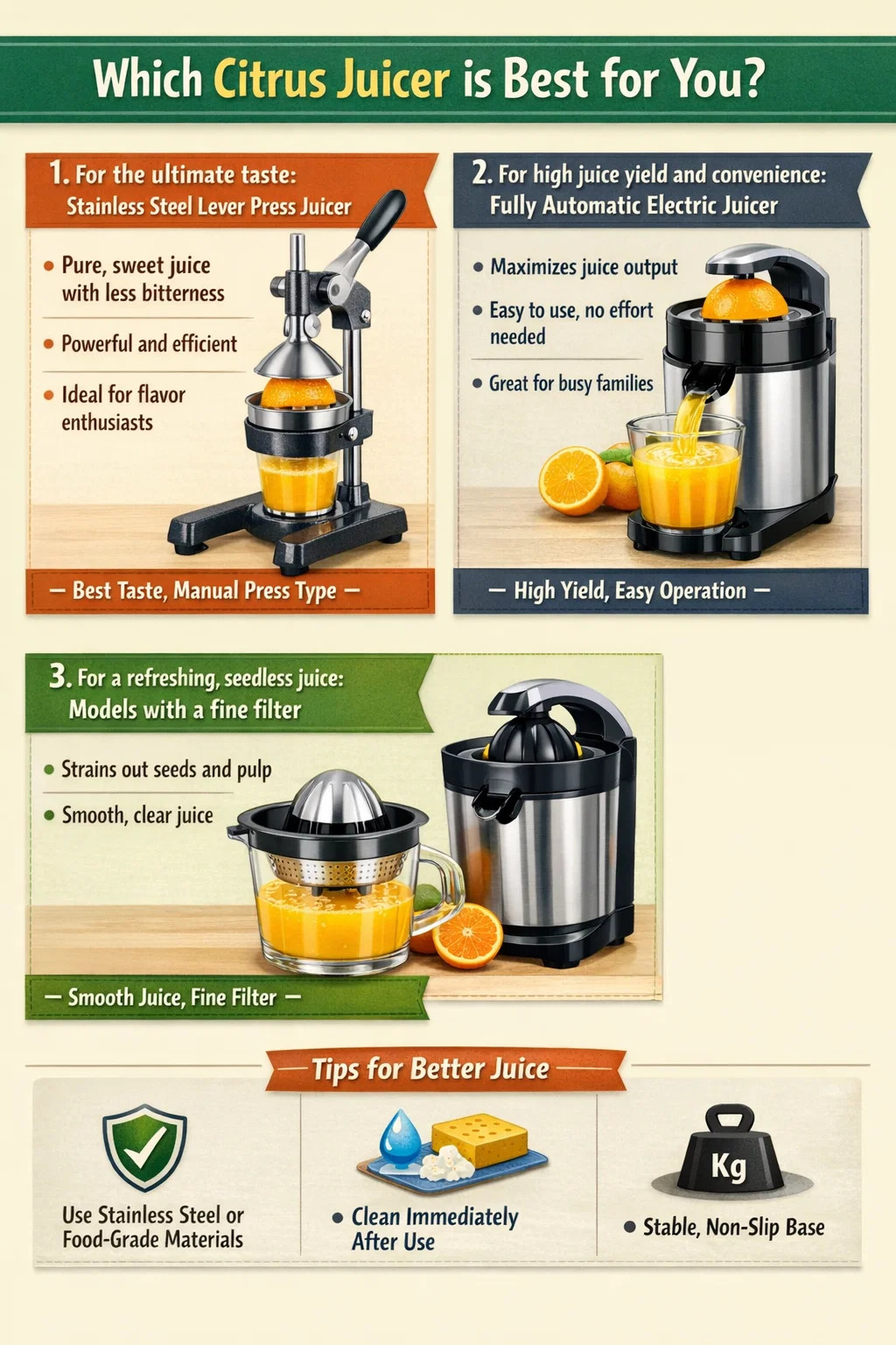 ⦁ Chất liệu rất quan trọng: Cố gắng chọn vật liệu bằng thép không gỉ hoặc dùng cho thực phẩm. Vì trái cây họ cam quýt có tính axit cao nên nếu nhựa kém chất lượng, theo thời gian có thể phát sinh mùi khó chịu, ảnh hưởng đến độ tươi ban đầu của nước ép.